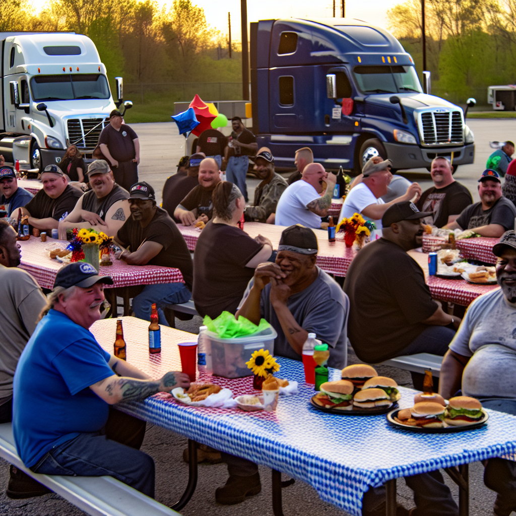 An engaging outdoor gathering showing truck drivers enjoying festivities and camaraderie, showcasing the spirit of community within the trucking industry.